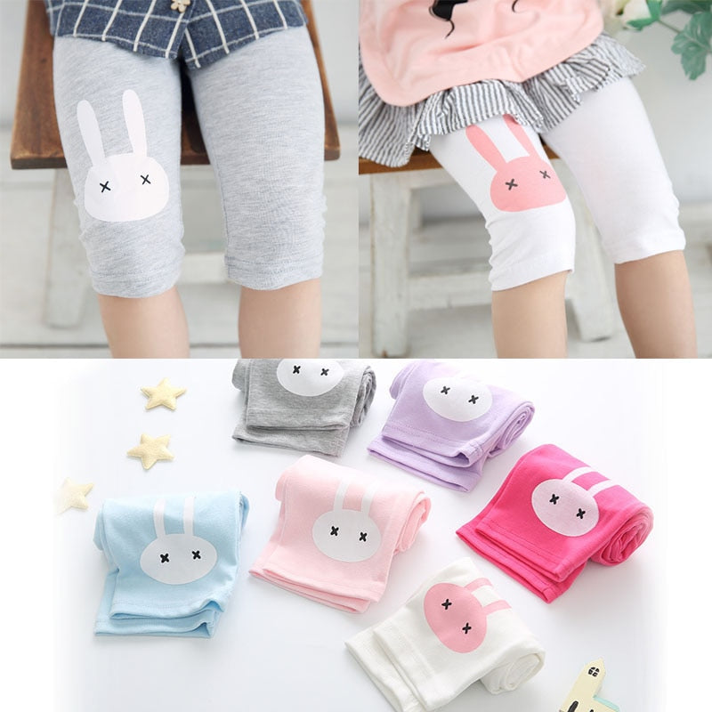 Have your little girl feeling cute and ready for spring in these fun Rabbit Knee Length Leggings. The leggings feature a solid color with a little rabbit on the thigh for a cute finishing touch. They stop just below the knee, making them perfect for running, biking and playing.