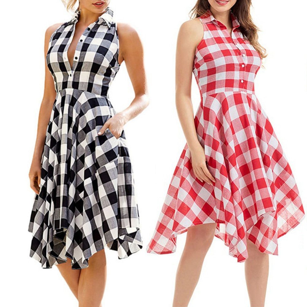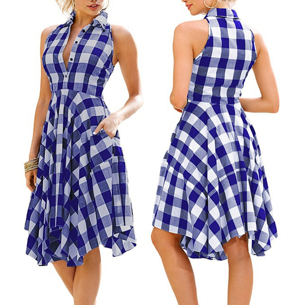 Stand out in this one of a kind Plaid Print Button Down Slim Sleeveless Irregular Midi Dress featuring a plaid print that is typically reserved for flannel shirts. Available in red, pink, blue and black, this comfortable dress universally boasts a halter top, a slim waist and a fluffy skirt that extends to the knees.